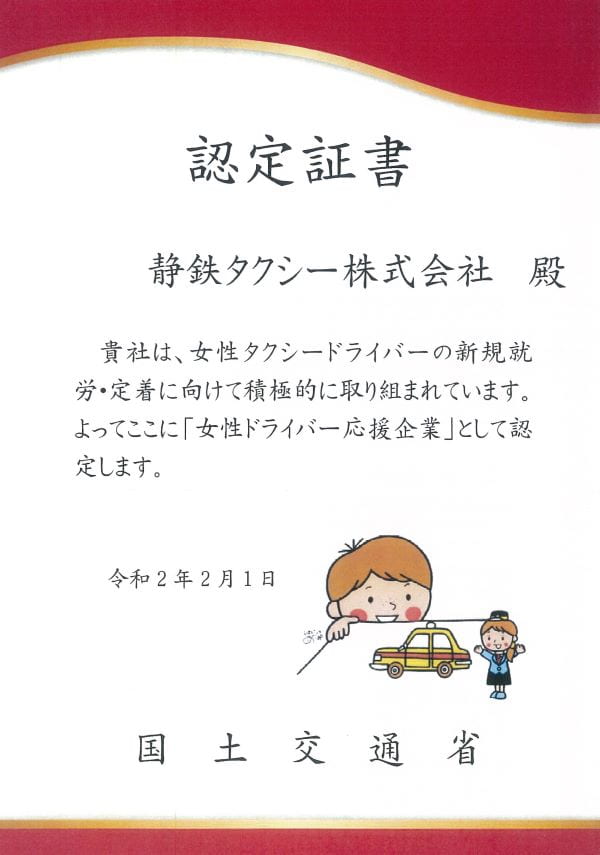 静鉄タクシーは2020年2月、国土交通省から「女性ドライバー応援企業」に認定されました。