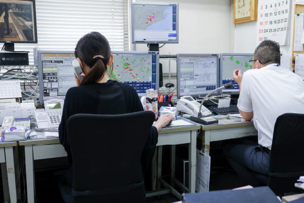 本社や配車センターがサポートするから大丈夫。配車センターでは、どの車両がどこに居るか常に把握しています。緊急信号が発信された車両に、すぐに応援を向かわせる事ができます。